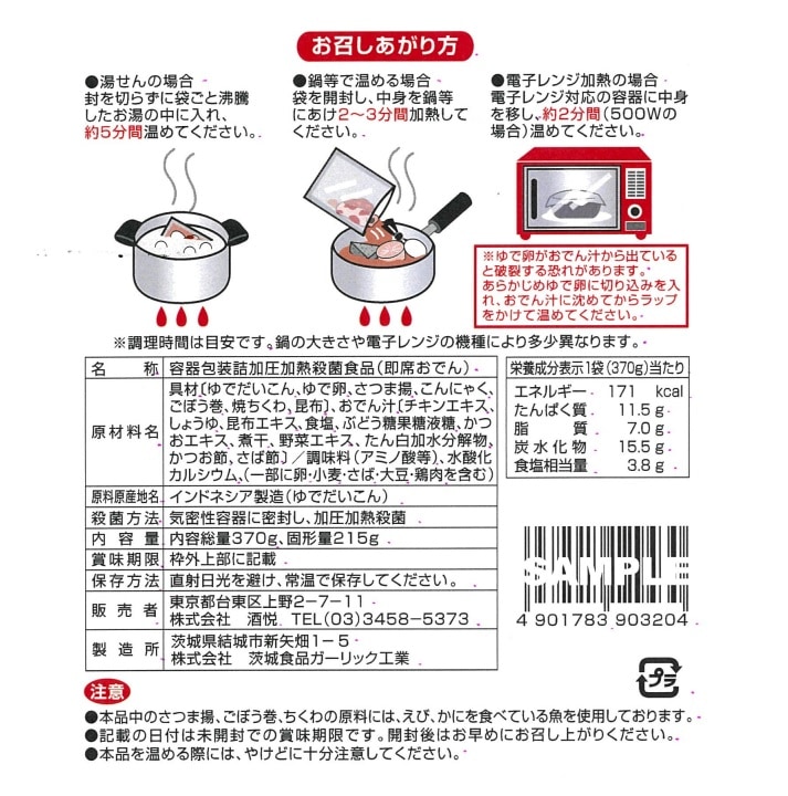 ゆでだいこん、ゆで卵、さつま揚、こんにゃく、ごぼう巻、焼きちくわ、昆布