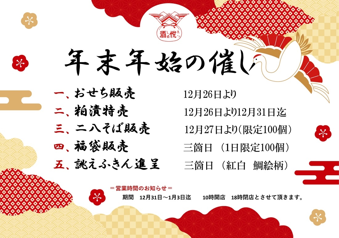 日頃より酒悦上野本店をご利用いただき、誠にありがとうございます。当店の年末年始の営業時間につきまして、下記の通りご案内申し上げます。ご不便をお掛けいたしますが、何卒ご了承くださいますようお願い申し上げます。来年も変わらぬご愛顧のほど、よろしくお願い申し上げます。